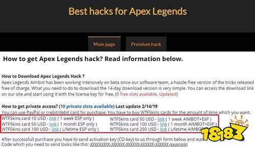 与国内相比,海外外挂的确更难找到,Reddit上讨论外挂的玩家并不多,但的确也存在。如18183找到一款能够提供锁头、透视、敌人朝向、长射程、雷达显示空投等多种功能的国外Apex外挂产品,相比国内售卖的功能要齐全一些,但价格也更贵,最低也需要10美元(67元)。另一款价格更贵,最低需要玩家支付25美元(169元)。