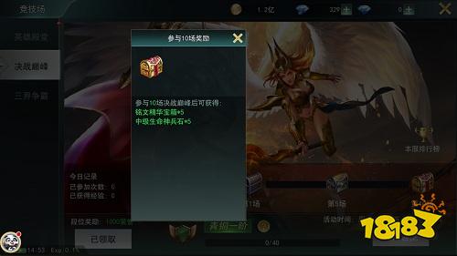 玩家每天前10场天梯比赛可获得额外经验奖励,超过10场的天梯比赛只获得积分,积分数量会决定玩家的段位排名和段位奖励。玩家完成1、5、10场比赛还可获得对应宝箱,开启宝箱可获得铭文精华和生命神兵石,这两种道具是强化铭文和生命神兵的必要材料。