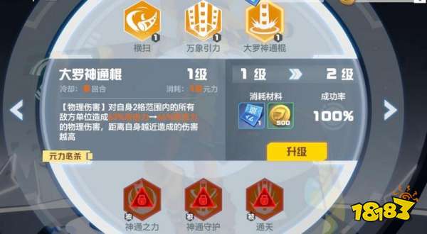 大罗神通棍:冷却6回合,消耗10元力。【物理伤害】对自身2格范围内的所有敌方单位造成63%(1级)的物理伤害,距离自身越近造成的伤害越高