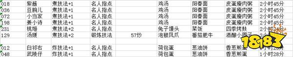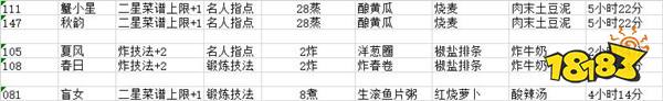前六名厨师的8点煮加成可供盲女直接修炼,后两名厨师的2点炸可供夏风和春日修炼。这里或许大家会有个疑问:同样是锻炼技法的厨师,为什么选择了汤媛而不是剩下的两名一火厨师呢?看时间,两名一火厨师做技法挑战的时间是2小时45分钟×2,长于汤媛的3小时。
