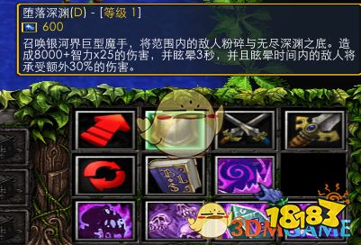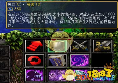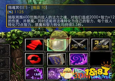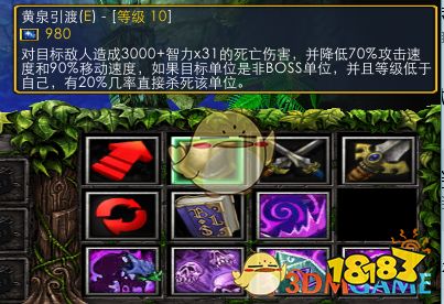 技能分级:对目标造成300*技能等级+(1+技能等级*3)*智力伤害,降低(20+5*技能等级)%攻速和最高90%移速。并且有20%概率秒杀等级比自己低的非英雄单位(不包括特殊单位,比如独人王,????等)
