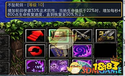 技能分级:增加轮回(3+技能等级*3)%法抗,并且生命值低于(12+技能等级)%时,增加大量回复直到50%,满级回复4800点。