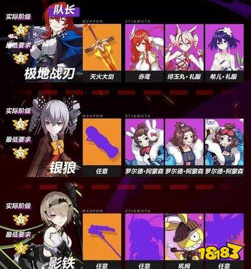 冰姬队长技提供异能系全伤,带礼服中下走站场型输出路线;银狼后台提供元素伤害加成;影铁后台提供对带盾条件下的元素伤害加成,带吼姆中提供拾取范围加成。