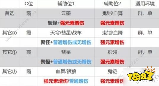 霞拥有着爆发与持续兼顾的特点,但在机制上需要一定时间(常用流程大概8-9秒爆发时间)才能够最大限度地利用技能输出,3.7版本实装的云墨丹心可以说是不二之选,长达15秒的增益时间足够切出另一个角色进行铺场再使用霞打完整套爆发,因此对群时鬼铠选择了叶采章全套(增益持续9秒)进行辅助。对单的情况使用血舞携带叶叶牛替换鬼铠伤害更高。