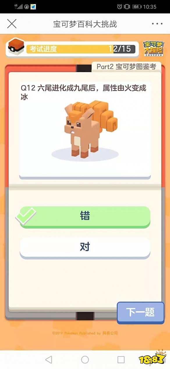 六尾进化成九尾后,属性由火变成冰?这是宝可梦大探险百科大挑战的活动,只要参与答题并且获得80分以上,就可以获得宝可梦正版周边,那么题目都有哪些呢?下面小编就为玩家带来宝可梦大探险百科大挑战答案,一起来看看吧。