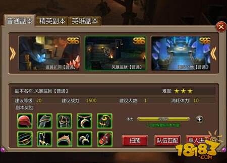 该副本根据不同等级分为六个场景:银翼矿洞、监狱风云、抄袭之地、沙漠王国、食人洞穴、熔岩洞窟,普通副本奖励均为优秀等级装备,所以在游戏初期时,没事打打副本,收到装备奖励也是不错的呢,还有就是该副本是可以扫荡的哦~