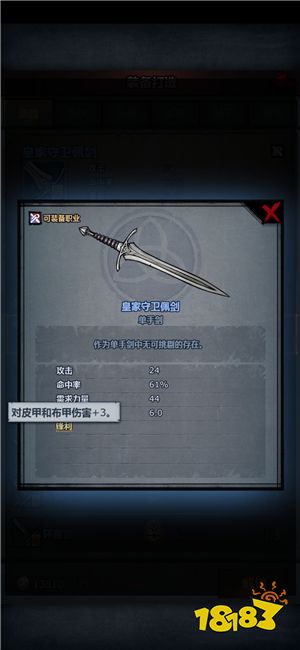皇家骑兵,王室禁卫单手剑,推荐皇家骑兵用帝国制式长剑,皇家骑兵本身暴击高,如果力技都是A-S高攻击最好了单手剑的优点是重量轻,命中高,打塔不衰减,皇家守卫佩剑略逊色于攻击低2点,虽然重量更轻,多一个锋利的特点(对布甲,皮甲+3伤害),但是制作价格高。刺杀长剑除了暴击,其他都逊色。