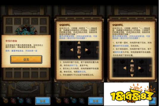 选择冒险者冈布奥出战,进入迷宫后,左上角书柜拾取奇怪的卷轴和古老的手札。