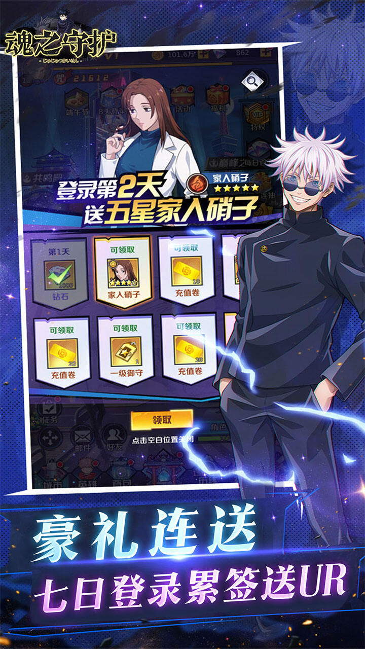 签到奖励绝不遗漏:次日登录领 UR 家入硝子,这是前期最强治疗角色;八日登录解锁 UR 乙骨忧太,妥妥的顶级输出;每天还能领 100 抽、五条悟碎片和 VIP 经验,核心角色不用氪金就能集齐。