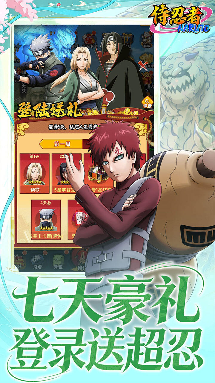 《侍忍者》上线送第七班礼包,充值永久0.05折!登录送豪礼,纲手、宇智波鼬、须佐卡卡西免费送。鸣人降临,完成进度送鸣人【九喇嘛】。还有七日目标送超阵容忍者。累计签到送千抽,每天招募不用停。超百位忍者,自由搭配出自己喜爱的阵容!