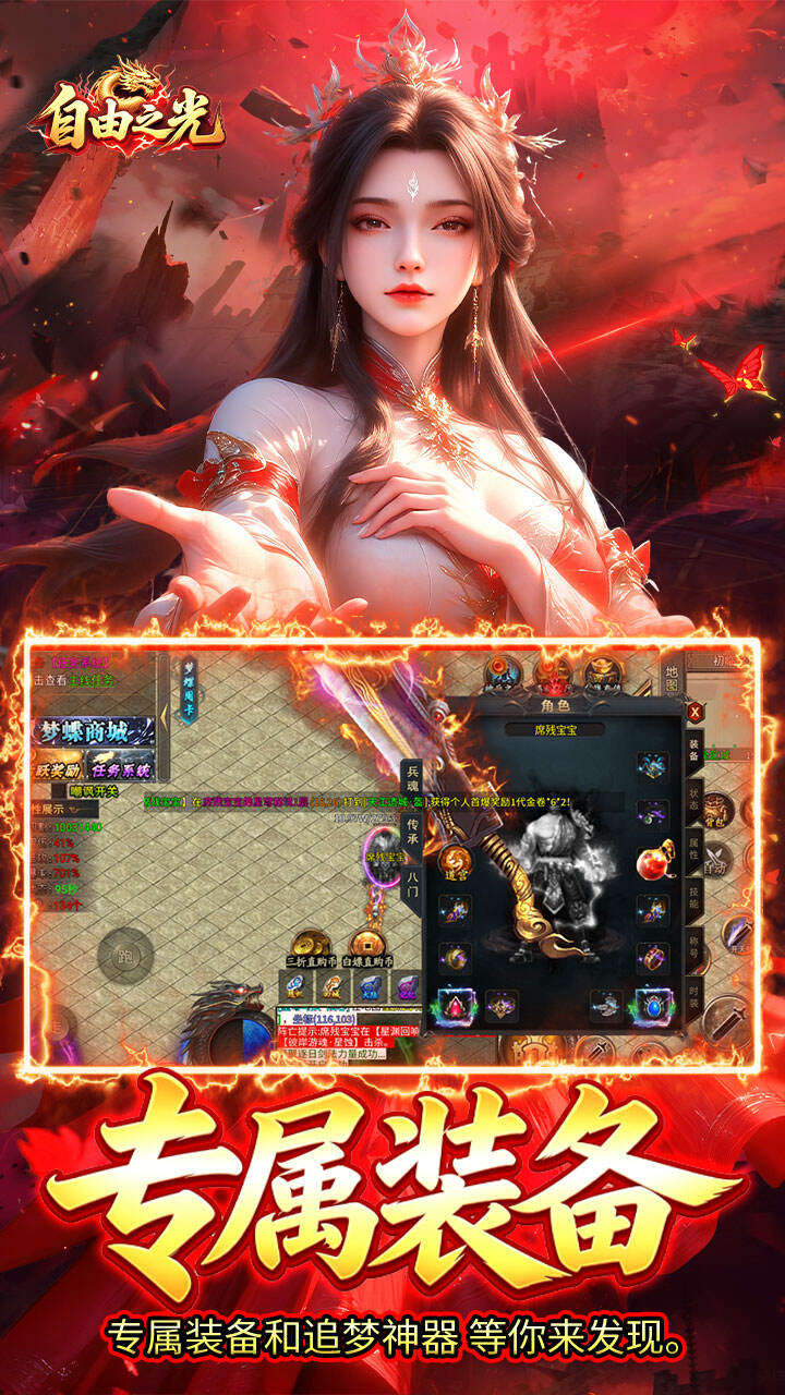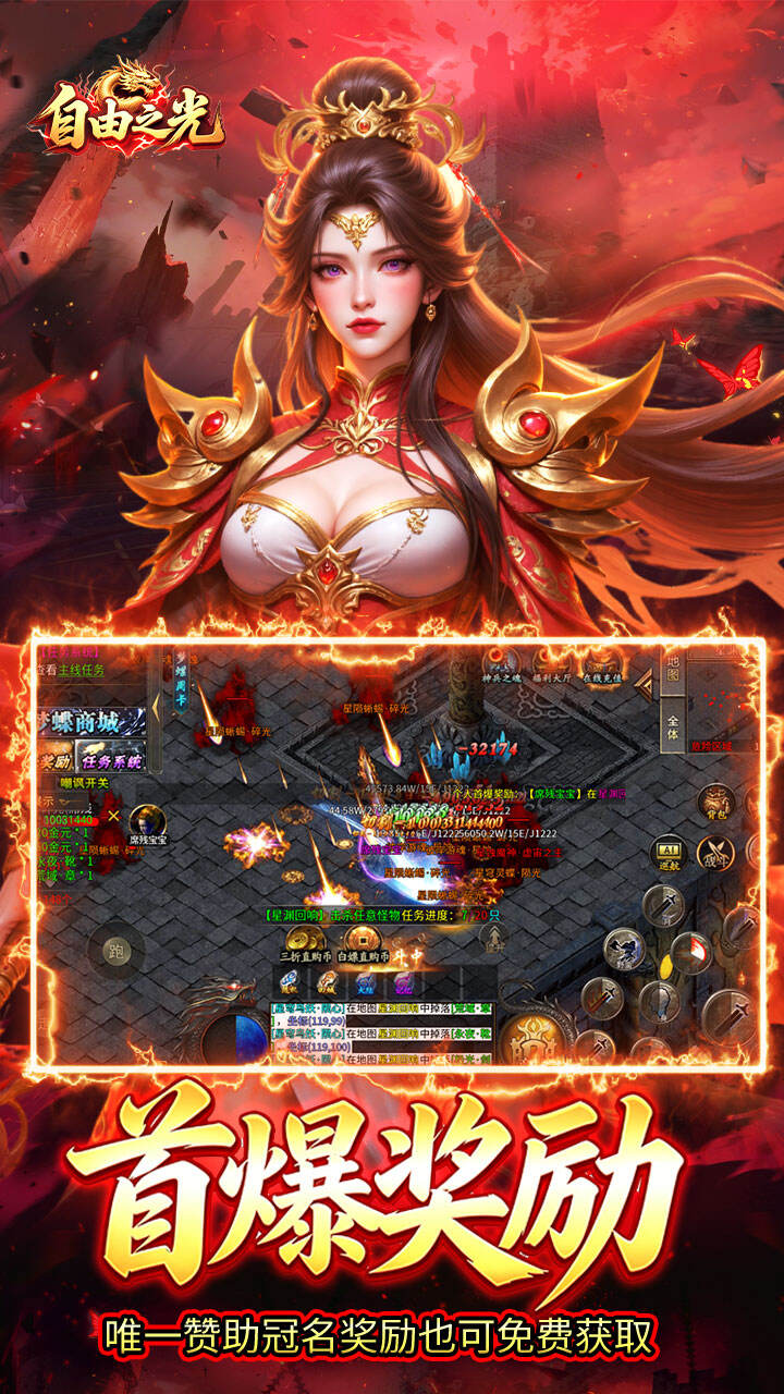 《自由之光》创角即送自动回收,自动拾取,每日赠送328红包.参与跨服趣味玩法,散人玩家也能在活动中获得巨大收益.全民白嫖,各种在线奖励,首爆奖励,保值回收大额元宝,装备全靠打,材料全靠爆,时间等于一切,白嫖照样毕业!