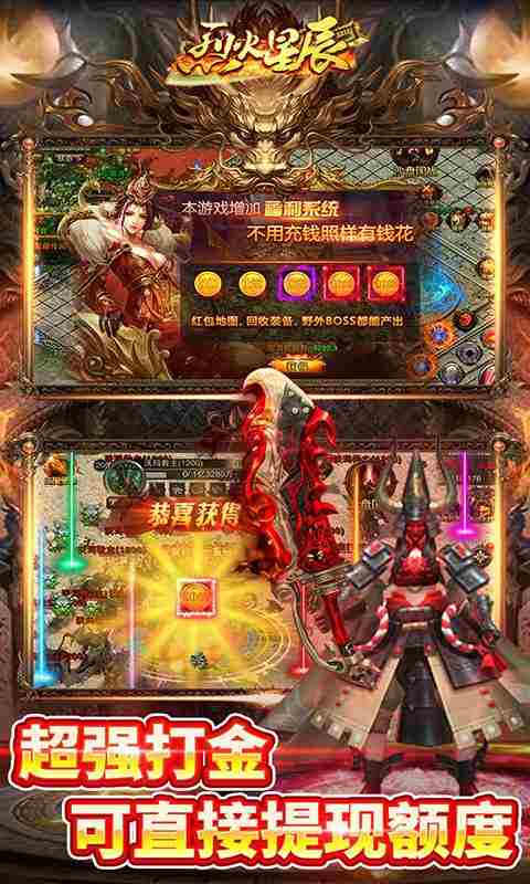 【烈火星辰】上线送VIP20,送1688888钻石,666万元宝,10万战神币,福利直接狂飙,免费称号、时装任性随便送,0氪也能当爷,经典传奇再现,超强打金,可直接提现额度。炫酷魂环,超强属性加成。特色30层创世地图,大量boss等你来收割,顶级装备全靠打,无限爆充值红包,不花钱照样满神装!热血城战,多服混战,千人攻城掠地,抢占专属创世地图