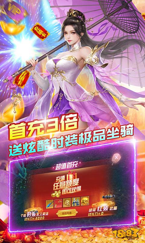1.开局贵族12,满V特权免费领 2.上线送88888元宝,700w铜钱 3.充值比例1:1000,首充3倍元宝 4.无限商城,升战道具每天免费领 5.线下活动道具返利加倍送 6.首充送炫酷时装,极品坐骑“鲲”,绝版红装武器,战力加不停