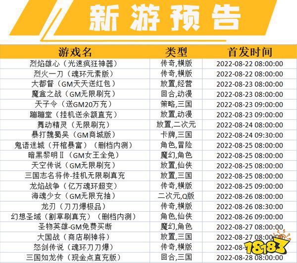 8.22~8.28新游预告,本周由《烈焰雄心-光速疯狂神器》领衔,共会有20款上线,下面小编为大家整理了新游名单,看看有没有你期待的游戏吧,可以抢先体验哦~