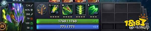 毒龙的属性成长算是中规中矩,作为一个敏捷英雄2.4的力量成长还算不错,但智力略显不足,所以毒龙会经常运小蓝以保证刷野效率。即便是25级的毒龙,蓝量也只有771点。