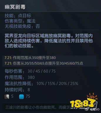 以上为近几个版本毒龙的改动数据,其中7.07版本重做了一技能“毒性攻击”:与原二技能合并。并重做了二技能“幽冥剧毒”:使目标区域内敌方单位受到持续魔法伤害,降低魔抗以及禁用被动(类似大隐刀的效果)。这使得例如钢背兽、哈斯卡、幻影刺客等被动技能被破坏会造成英雄实力大幅度削弱的英雄非常惧怕毒龙。