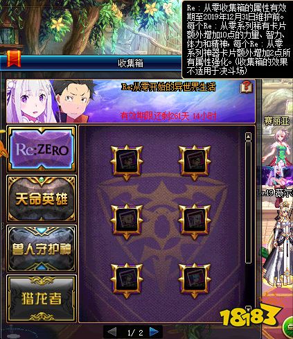 收集箱属性:每个Re:从零系列稀有卡片额外增加10点力量、智力、体力和精神,每个Re:从零系列神器卡片额外增加2点所有属性强化。集满所有卡片一共可以增加50点力量、智力、体力、精神和10点所有属性强化。