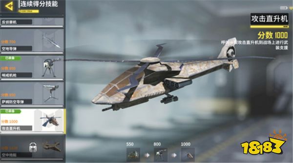 使用技能后会呼叫一架攻击直升机到战场中,攻击直升机会自动索敌进行攻击。