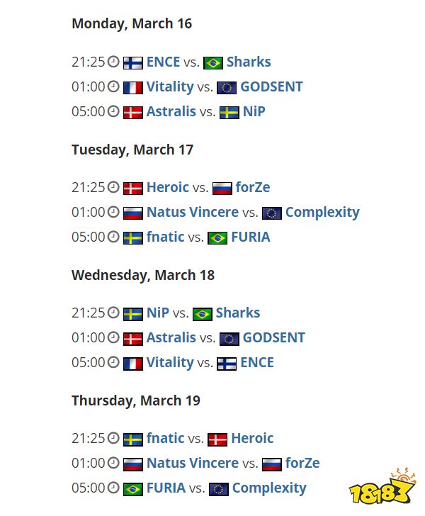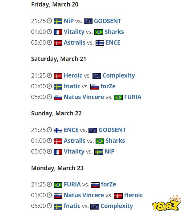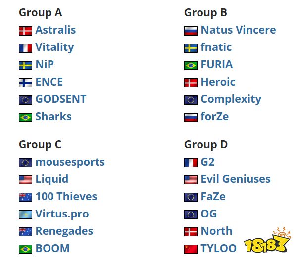 A组由Astralis领衔,紧随其后的有Vitality、NiP和ENCE三支渴望在2020年找回自己世界排名的队伍,剩下的是GODSENT和Sharks。B组由IEM卡托维兹新科冠军NaVi和强大的fnatic带领,同样被分到B组的还有FURIA、Heroic、forZe和Complexity。