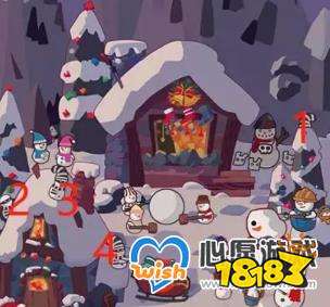 小玩法3:先拿到右下角花盆下面的“凹型兔头装饰”,给右上角的面具雪人,然后拿他的面具给左上角蓝色帽子的雪人,再拿花给蓝色帽子的雪人。
