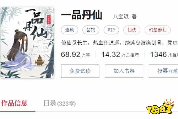 一品丹仙是一部目前正在起点中文网由八宝饭连载的仙侠网络小说,是以主角刺客吴升转变为一位丹师为作品主线的修仙小说作品,目前已经连载了69.13万字,共发布了324章,并收获了14.37万的总推荐。