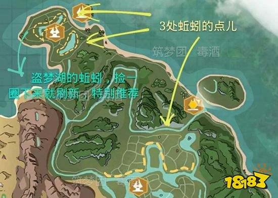 钓到精灵鱼需要蚯蚓,推荐图中3个地点。 其中盗梦湖周围有点草莓,银矿。捡蚯蚓的同时,蒸汽石与草莓3不误。