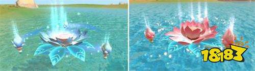 蓝-清水芙蓉,蓝白配色,在天气渐暖的时节,让人倍感清凉,大家可以从商城购买获得。红-清水芙蓉,粉红配色,像盛开的赤色莲花,看上去鲜艳而又温暖,需要大家通过转盘获取。
