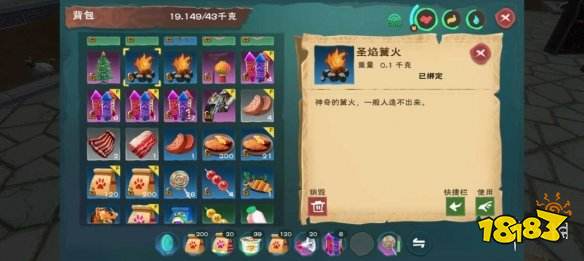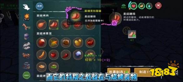 “圣焰篝火”听名字十分特别,在体型上比篝火大上一号,在温度提升,安全buff效果,覆盖范围上与篝火是相同的,而它的特别之处在于烧烤食物。