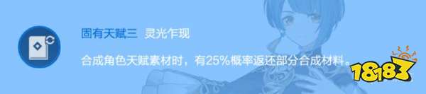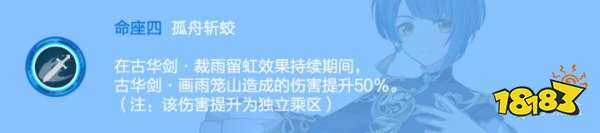 提升大招伤害,能快速回复能量。剑雨伤害提升23%,同时大约可以回复9-12点能量,不受充能效率加成。核心命座之二。