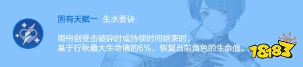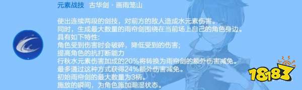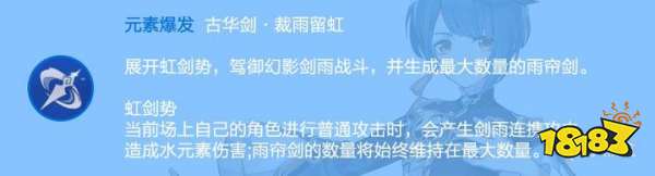 E技能产生的围绕自身的雨帘剑能持续对周围敌人上弱水元素附着(间隔大约2S)。施放Q技能时也能产生围绕自身的雨帘剑,两者的雨帘剑的效果是完全一样的。Q技能在产生雨帘剑的同时,能够在角色普攻时产生剑雨,剑雨能够造成单体伤害并且能每隔大约2-3S进行一次弱水附着,该水附着和雨帘剑的水附着相互独立。