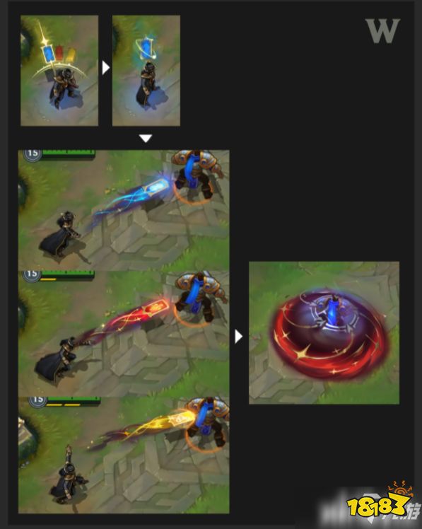 通常而言1个英雄拥有4个技能,针对每一个技能设计对应特效也只需要设计四种不同效果即可。但是崔斯特由于技能的特殊性,因此在技能特效的设计上,并不是仅仅只是针对单个技能设计,而是针对每一张卡牌进行特效设计。