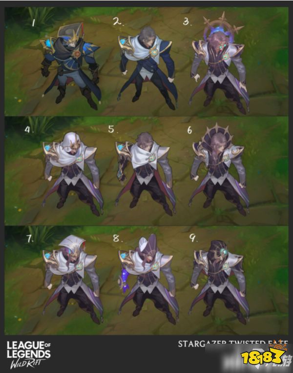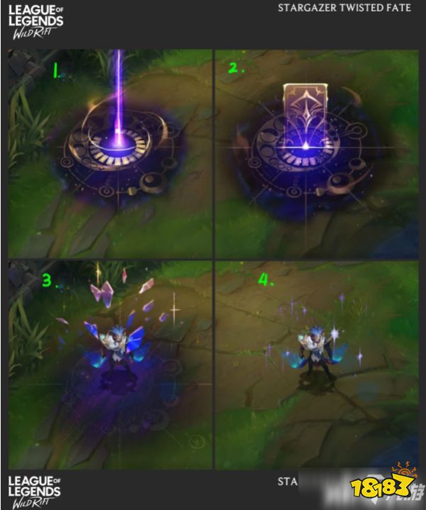 细心的召唤师应该早已发觉——在使用星域18183皮肤进行游戏时,2技能【选牌】释放后,红、蓝、黄三种不同的卡牌,所呈现的视觉效果不单单只是颜色不同而已,星芒阵的图形也是各不相同的。