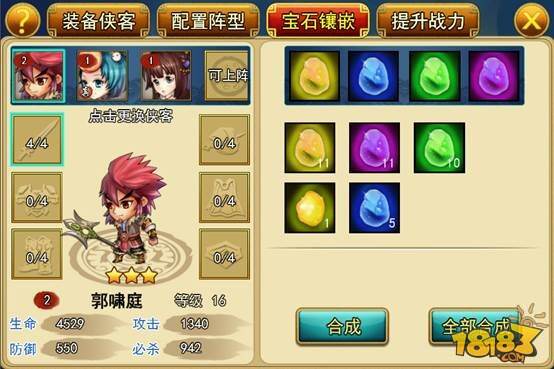 宝石可以镶嵌在装备栏里提升额外的属性,每个装备栏可以镶嵌4种不同的宝石,不能镶嵌同一类型的宝石。宝石可以合成每次合成需要消耗3个同等星级的宝石。