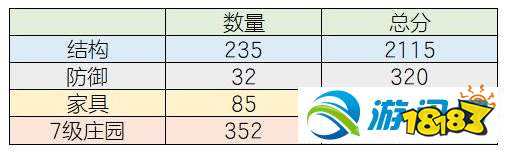 以7级庄园为例,结构、防御和家具都有数量限制,能达到的分值也有上限。