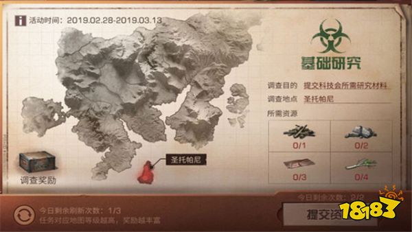 2、感染调查,科技会针对近期的感染暴发做针对性调查,活动期间提交科技会所需研究资源,即可获得调查奖励,任务对应的地图等级越高,奖励越丰厚。