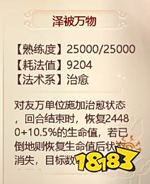 该技能的效果也只和法术熟练度有关系,和人物等级无关。这是一种全新的补给模式,也许在回血的补给量上不及男鬼,但是它的回复效果相当霸道,只要身上有泽被万物的状态,就等于有一个做鸟兽散加身,回合结束时只要有一个单位站立,那么有泽被万物效果的倒地单位都会重新站立起来。而且这个技能效果可以持续两回合,只要没有倒地,那么这个泽被的效果可以持续到第二回合,跨回合补给也是男鬼做不到的。