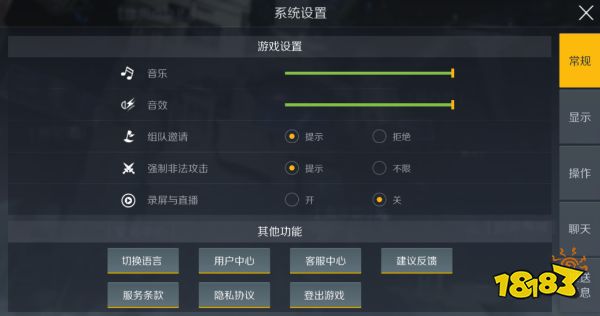 通过主菜单您可以进入“系统设置”功能,在这里您可以对游戏的渲染品质、音效音量、显示语言、聊天频道、推送消息等进行详细的设定。特别是当您觉得游戏运行不够流畅时,可以在“显示设置”中酌情降低显示帧率、贴图质量、特效质量和模型质量等选项。