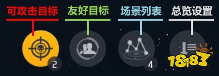 战斗总览根据区划可以分为上下两部分:上半部分的4个圆形按钮称为总览切页,其分别代表:可攻击目标、友好目标、场景列表和总览设置: