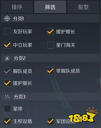 筛选决定不同总览切页中的筛选规则,隐藏玩家觉得不需要显示的目标,如:友好玩家、星门海关、援护舰长、星体等;
