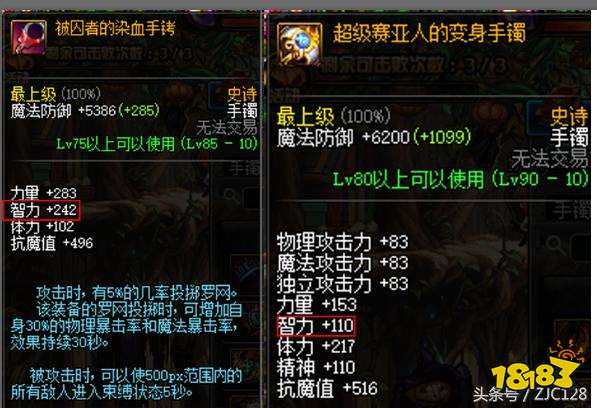 史诗手镯的选择有2种,一个是85的手铐,一个是赛亚人手镯,智力的提升也是很多的~深渊出什么样手镯就带什么样的手镯吧~