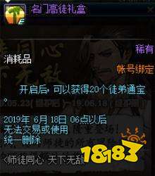 在师徒同心,天下无敌活动期间内成为徒弟,将会获得一个名门高徒礼盒,开启后可以获得20个徒弟通宝。