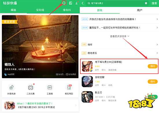 2.安装好后,打开好游快爆,点击右上角的搜索按钮,输入“地下城与勇士”,待游戏出现后点击旁边的【预约】按钮即可进行预约。