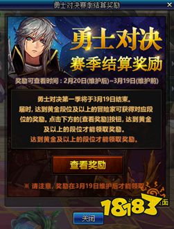 不知不觉间,勇士对决第一季也迎来了落幕。在3月19日,100级版本上线的同时,勇士对决第一季将自动结束。黄金及以上段位的勇士能获得对应段位的奖励,也是一个不错的结果。奖励在3月19日赛季结束后才能领取,各位小伙伴届时不要忘记领取哦!