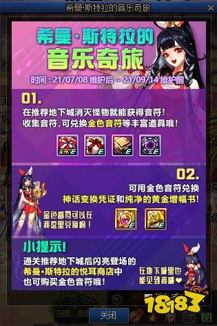 这个活动就是【希曼·斯特拉的音乐奇旅】,玩法相当简单,只需要在推荐地下城内收集[音符],然后在商店兑换金色音符与其他奖励道具。