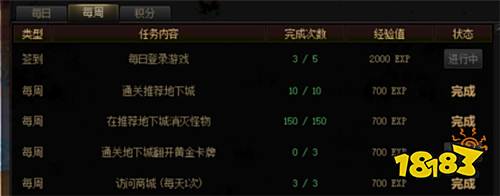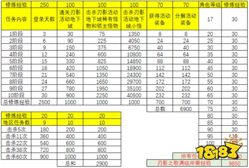 统计了所有修炼任务可获得经验,以及升满级需要9850点修炼经验,所以推荐玩家把每个区域的每个图均通关38次后(很多图的稀有怪物不止一个,所以能够完成部分击杀60次的任务),并且把登陆天数、通关刃影活动地下城、击杀稀有怪物和领主、击杀怪物、获得活动装备、分解活动装备10阶段任务完成,应该就在满级附近了。也就是30天左右就可以把该活动所有奖励都拿到手,并且别忘了可以用刃影徽记在商人波西亚处购买物超所值的奖励。