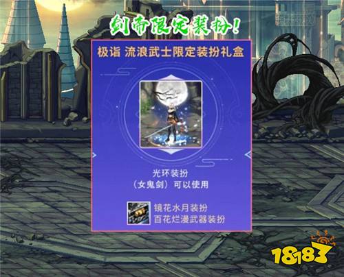 剑帝限定武器和光环装扮,当初十分火爆,甚至出现售罄的迹象,镜花水月+百花烂漫搭配,貌美如花的颜值无形之中加分!而今刃影出现,作为女鬼剑士一姐,剑帝限定武器和光环装扮同样能佩戴,但代价比较大,普通玩家无法承受。