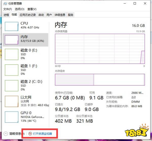 dnf在开启状态下,在任务管理器里面点性能--打开资源监视器,就能看的这个“memory compression.exe”进程了。