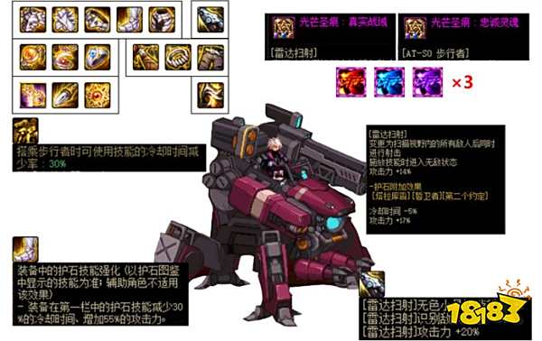 加点方面直接把搭乘步行者能够释放的技能([雷达扫射]、[爆裂飞踢]、[磁力手雷]、[三连霰弹]、[改装榴弹]、[瞄准射击])和[AT-SO 步行者]点满即可,其他按喜好随便点。另外,在使用[AT-SO 步行者]护石后,以上六个技能均可以在步行者射击、前冲时无动作释放,且相互之间互不影响。也就是说亮了就按,完全没有+真空期。