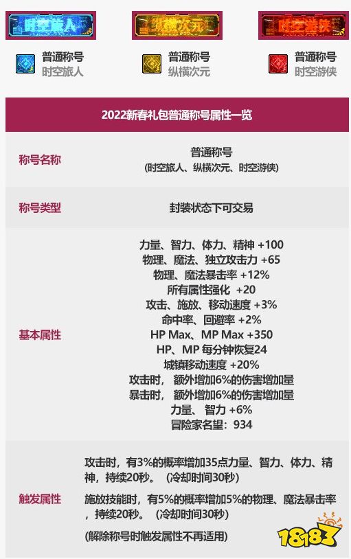 DNF2022春节称号属性力量、智力、体力、精神+100,物理、魔法、独立攻击力+65,物理、魔法暴击率+12%,所有属性强化+20,攻击、施放、移动速度+3%,命中率、回避率+2%,HP Max、MP Max +350,HP、MP每分钟恢复24,城镇移动速度+20%,攻击时,额外增加6%的伤害增加量,暴击时,额外增加6%的伤害增加量,力量、智力+6%,冒险家名望:934。
