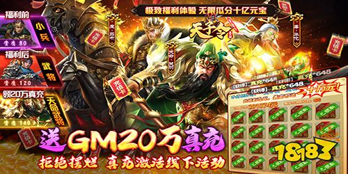 ★上线即送200万元宝,1亿铜钱,GM资源包,免费解锁GM1,登录签到免费领取海量道具,5星超强战神关羽,1000GM币,百连抽,领到最后应有尽有!